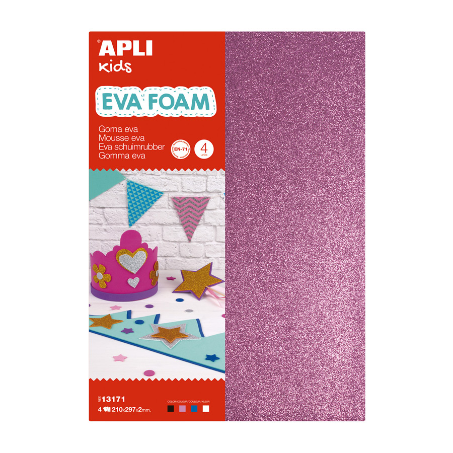 EVA foam glitter sheets in 4 different colours, format A4 (210 x 297 mm), 2 mm thick. A pack contains the following colours: white, black, red and blue. Each pack contains 4 sheets (1 sheet per color). EVA foam is an ideal material for crafts both at home and at school. It is soft, flexible, easy to cut, paste and paint. It is also impermeable and can be molded in the form of heat. The basic material for making fofucha dolls, masks, crowns, costumes and all kinds of handicrafts.