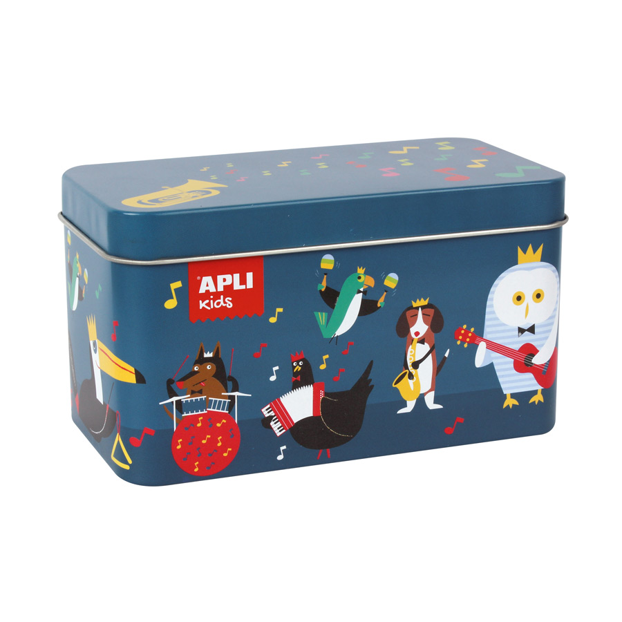 Puzzle with musical instruments, association puzzle from APLI Kids where children have to connect each piece of the puzzle with the puzzle of the instrument being played. A product with an original presentation and an attractive design in a rectangular colorful metal box, also useful for storing children’s items.