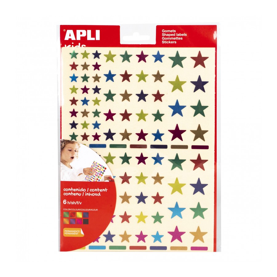 Educational stickers permanently adhesive, in various metallic colours: green, orange, pink, blue, red, lilac and yellow. Three different sizes: 10mm, 14mm and 20mm. Each bag contains 6 sheets of different stickers, a total of 624 stickers. An indispensable product in every home and in every school. Before children learn to use pencils or paint, these stickers can help them get started in the world of colors and shapes. Playing and creating with stickers is a basic activity to develop fine motor skills while working on different skills and abilities such as the knowledge of colours, geometric shapes and sizes; development of logic and creativity; teamwork or concept of space, among others.